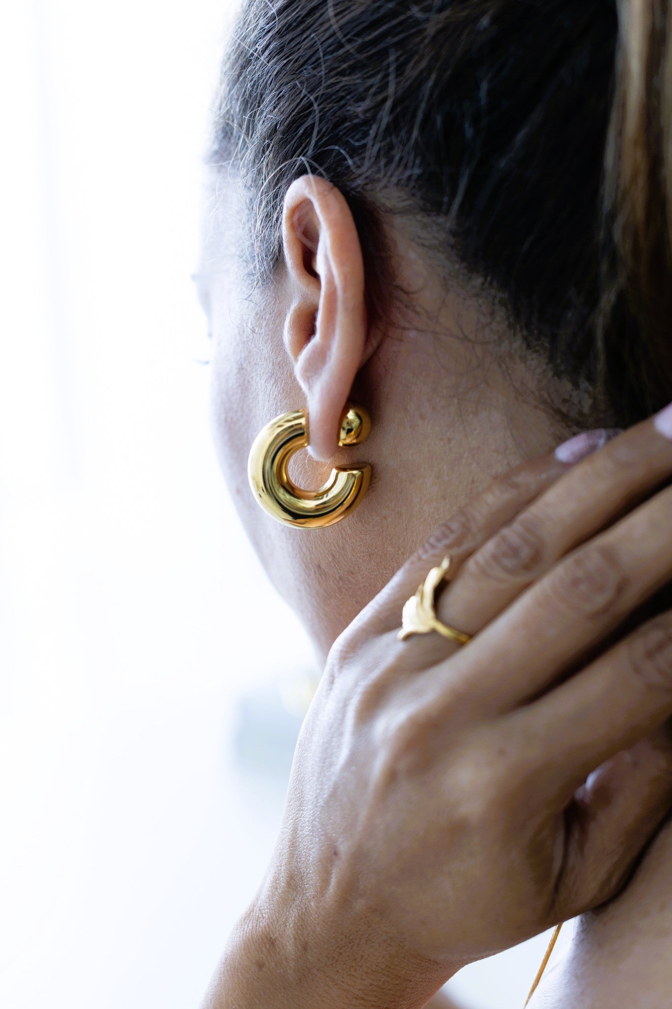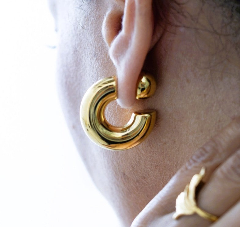 The gold-plated ball clasp, paired with a 12 mm pin, adds a touch of luxury and secure comfort, while the 3 cm height and 1 cm thickness create a sculptural silhouette that enhances any look. Designed for the modern woman who values both style and versatility, the L’Ultimate Hoops are the ultimate expression of refined confidence.
