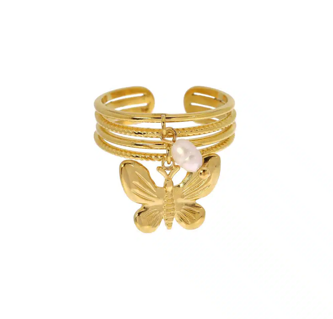 Papillon Nacrée Ring captures the beauty of transformation and grace. Crafted from gold-plated stainless steel, this exquisite multi-row ring features a delicate butterfly pendant paired with a luminous freshwater pearl, creating a perfect harmony of elegance and femininity.